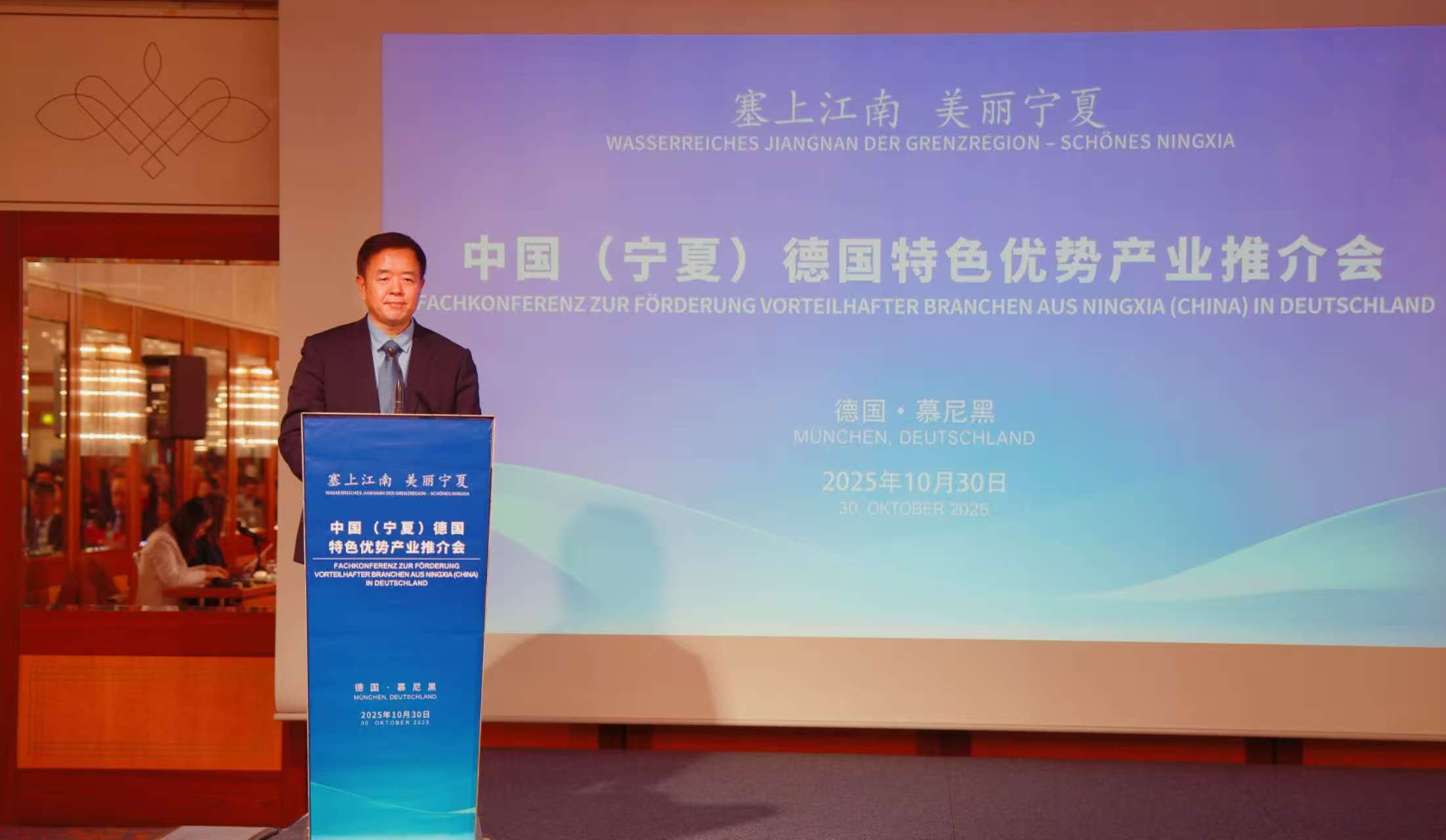 The China (Ningxia)-Germany Promotion Meeting of Specialty and Competitive Industries was successfully held in Munich, Germanyon October 30, 2025. The event was graced by over 100 attendees, including government officials, leaders of chambers of commerce, and corporate representatives from Germany.It featured addresses by Qiu Xuejun, Consul General of China in Munich, Bai Yuzhen, Director-General of the Ningxia Foreign Affairs Office,Armin Schwimmbeck, Head of the International Cooperation Departmentof Bavarian State Ministry of Economic Affairs, RitaRoider, China Affairs Director of the Munich Department of Labor and Economic Affairs, and Erhard Rau, President of the German Association for Economic and Cultural Promotion. It also featured themedpromotions on Ningxia’s key industries by Chen Zijun, Deputy Secretary of the Party Working Committee of Administrative Committee of Ningxia (Helan Mountains’EasternFoot) Wine Industry Park, and Zhou Tao, Chief Engineer of the Ningxia Forestry and Grassland Administration.