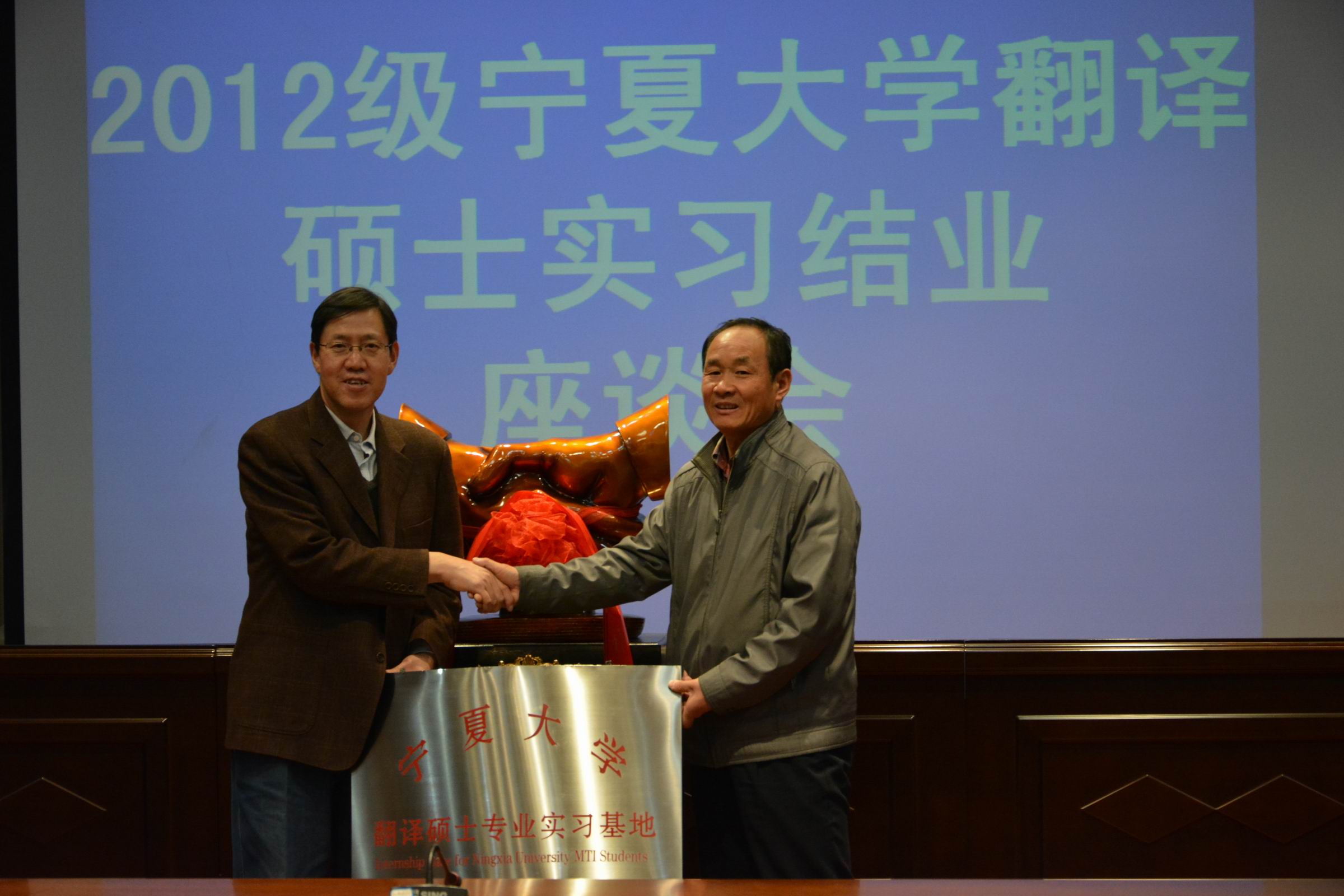 座谈会后,自治区外办杨新润副巡视员与宁夏大学外国语学院周玉忠院长共同为自治区外办翻译硕士专业实习基地授牌。