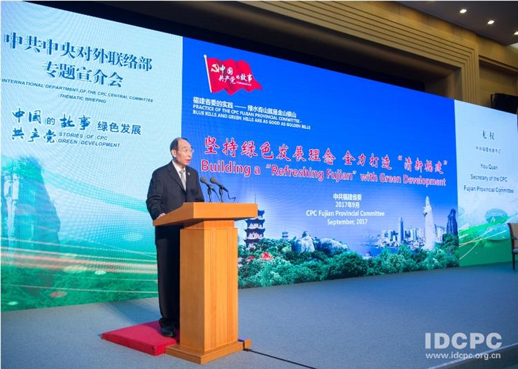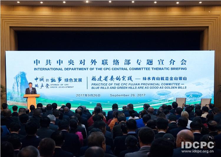 9月26日上午,中联部举办“中国共产党的故事——绿色发展”专题宣介会,邀请中共福建省委以“绿水青山就是金山银山”为题,向访华的外国政党领导人、外国驻华高级外交官以及国际组织和外国商会代表等介绍习近平总书记关于生态文明建设的重要思想理念和绿色发展在福建的生动实践。