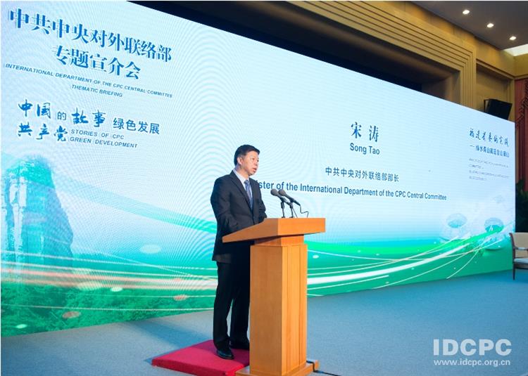 中共中央对外联络部部长宋涛在会上指出,中共十八大以来,以习近平同志为核心的党中央将绿色发展作为关系国家发展全局的重要理念,把生态文明建设放在治国理政的重要位置。中华文明历来主张“天人合一、尊重自然”,追求人与自然的和谐发展。我们党立足中国现实国情,从传统文化和国际发展经验中汲取智慧,将生态文明建设写入党章,引导政府、企业和公众共建生产发展、生活富裕、生态良好的发展新格局。