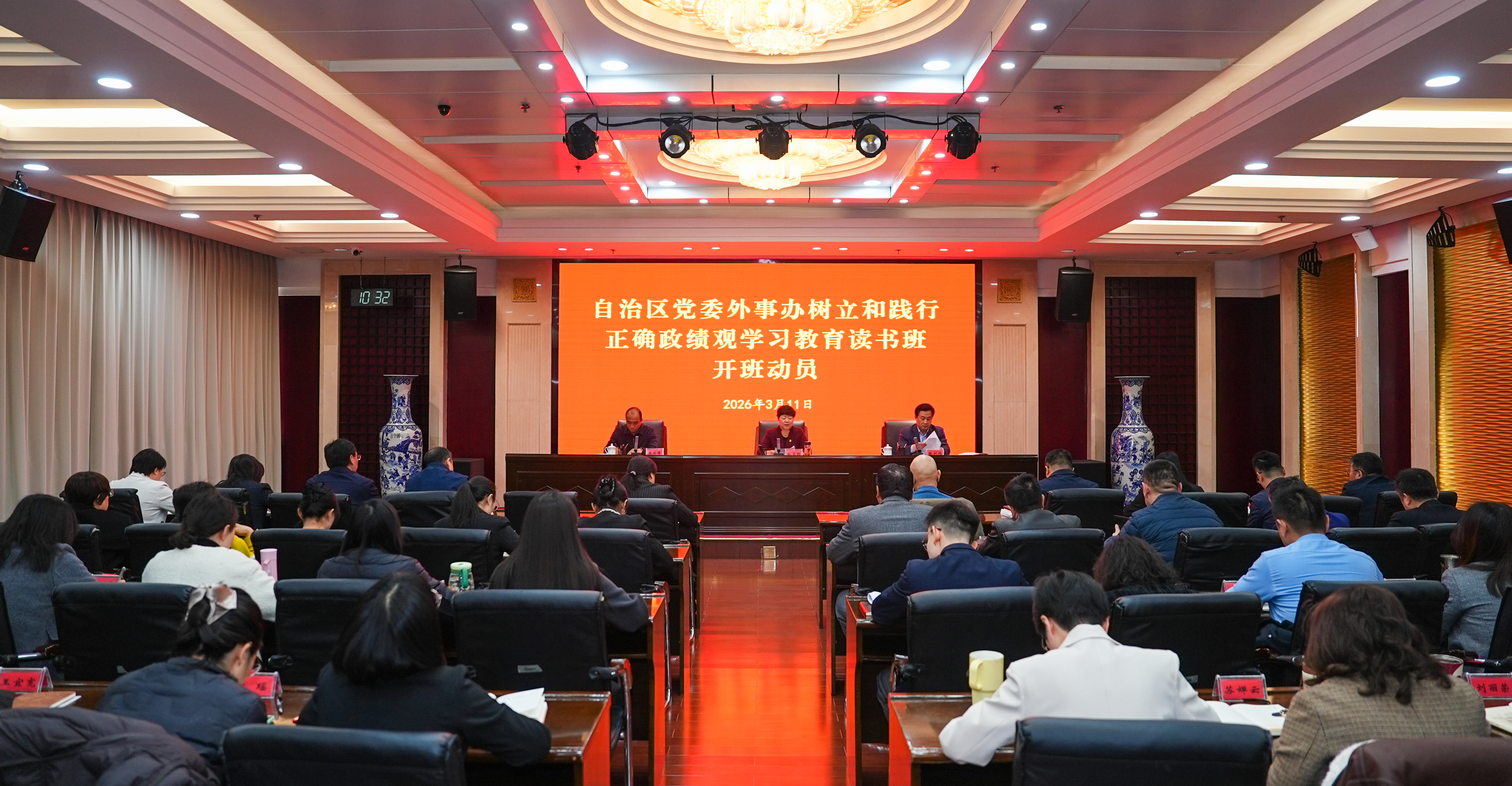 3月11日,自治区党委外事办树立和践行正确政绩观学习教育读书班开班,白玉珍主任主持会议并作开班动员。本次读书班为期三天,采取“集中学习+个人自学+专题辅导+研讨交流”相结合的方式进行。